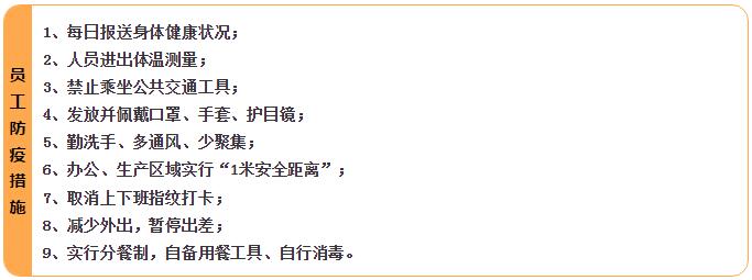 疫情防控領導小組將一次性醫用口罩、一次性防護手套、護目鏡等防疫物資統一調配,分發給每位復工人員,各部門組織員工對生產區、辦公區等人員密集場所積極開展環境衛生大清潔、大消殺,對人員經常接觸的門把手、照明開關進行消毒液擦拭、噴灑。